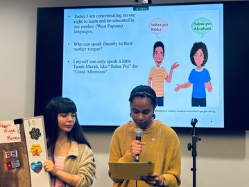 Language is a powerful tool for com-munication, bringing gaps and encou-raging understand between individuals community and culture. Pictured are Ribka Ovide and her fried presenting office report the importance of know-ing and understanding you mother tongue.